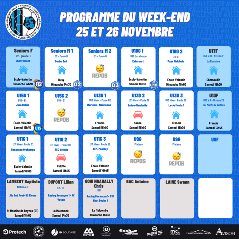 Beaucoup de rencontres à domicile, seuls 3 (courts) déplacements, pour les U11 (2), les U13 (2) et l'équipe fanion qui va devoir s'employer pour ramener un bon résultat si elle veut passer l'hiver bien au chaud ! 💪
